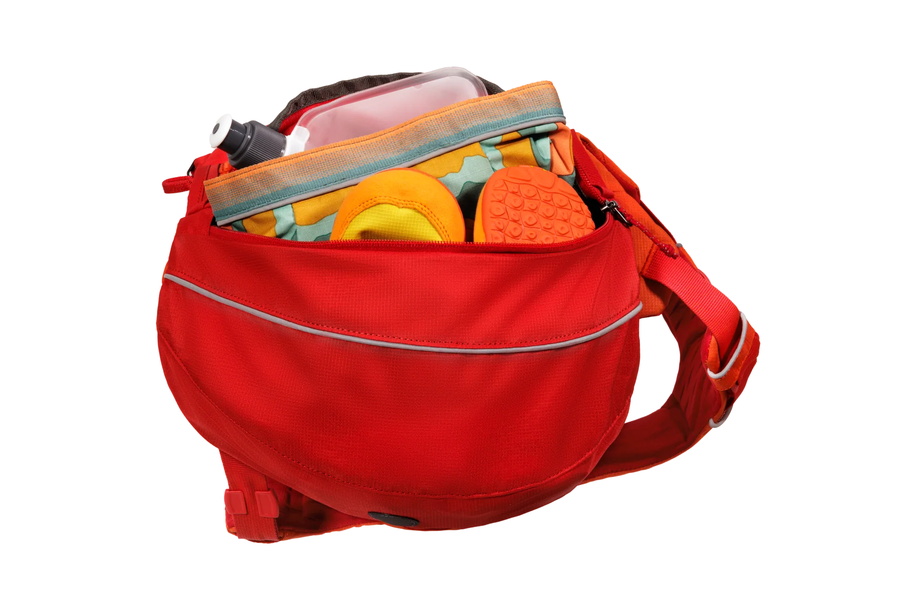 Radial cut, weight-forward saddlebags offer stable and comfortable gear carry, and an internal mesh pocket and external daisy chain system offers flexible organization for your dog's trekking necessities like a sleeping system, food, or hydration. Six points of adjustment provide an optimal fit, three leash attachment points allow for secure leash-canine connections, and reflective trim with an integrated light loop for The Beacon™ help boost visibility in low-light conditions.